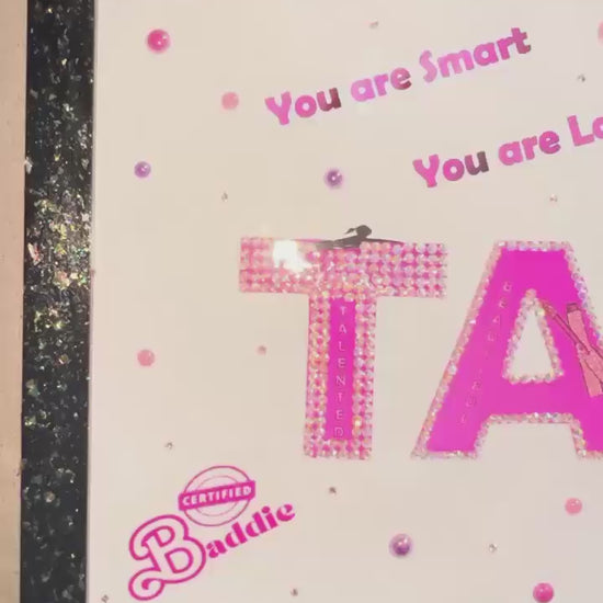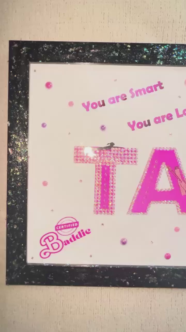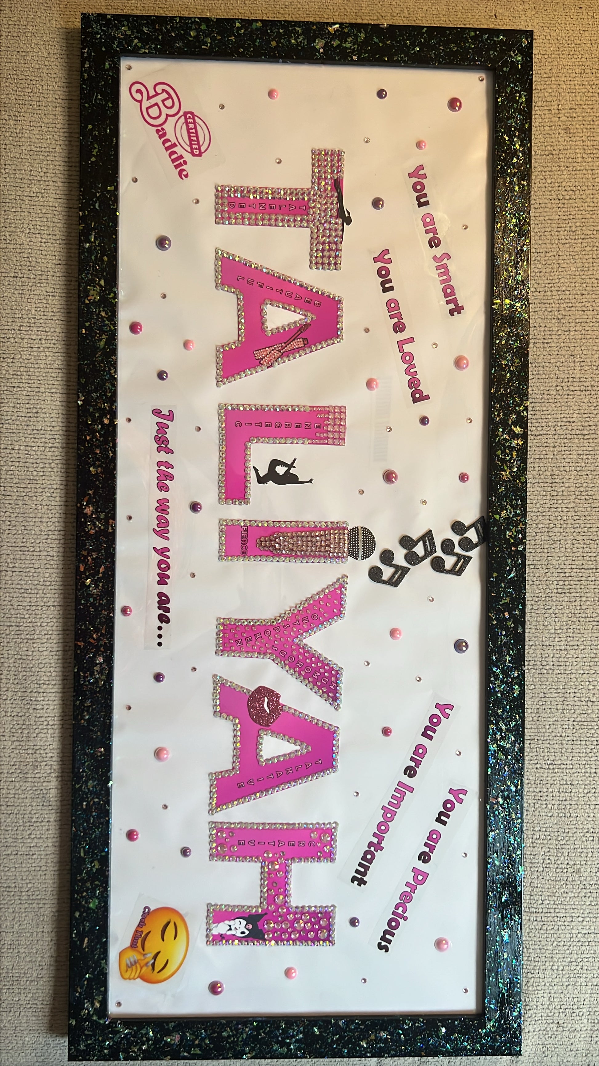 12x30 inch frame. Black frame base covered with a shimmery glitter, filled with pink and purple lettering and iridescent rhinestones. It is perfect for adding a touch of uniqueness and personality.
