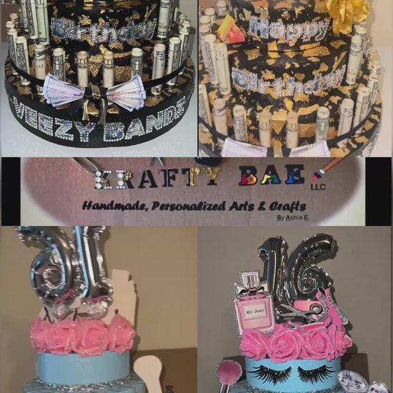 Custom Hand crafted money cake, shaped like a real cake and beautifully decorated. The tubes are to be filled with the amount of money of choice (price is just for the money cake only. If you'd like me to add the money for you, it'll be extra of the amount you request). Also includes a special message cake topper.