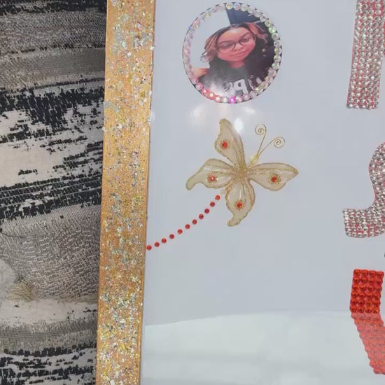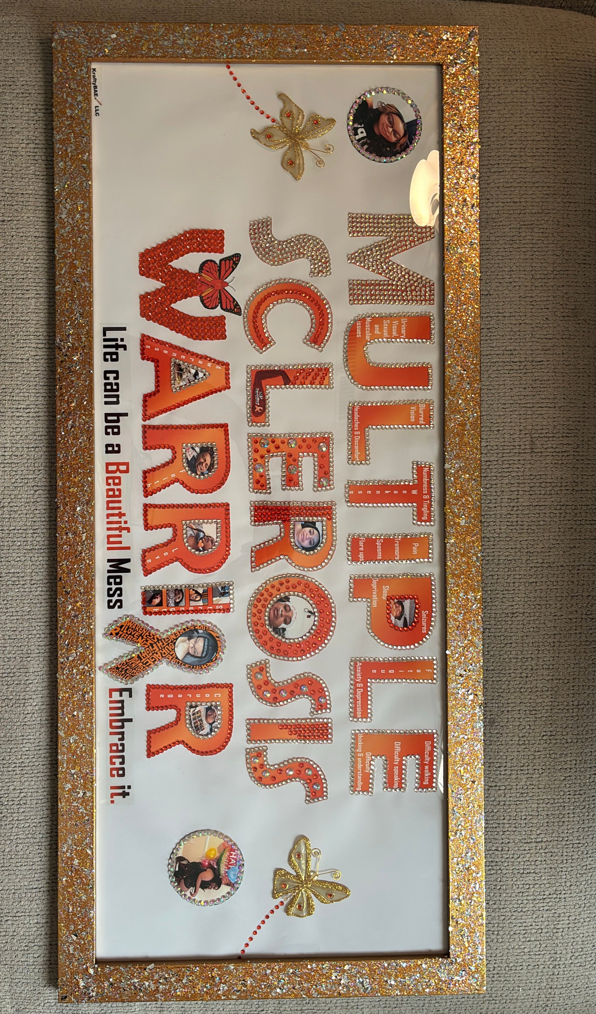 12x30 inch frame. Black frame base covered with Orange, Gold and Silver glitters, filled with orange lettering, rhinestones, and pictures of a MS warrior. It is perfect for adding a touch of uniqueness and personality. It is perfect for adding a touch of uniqueness and personality.